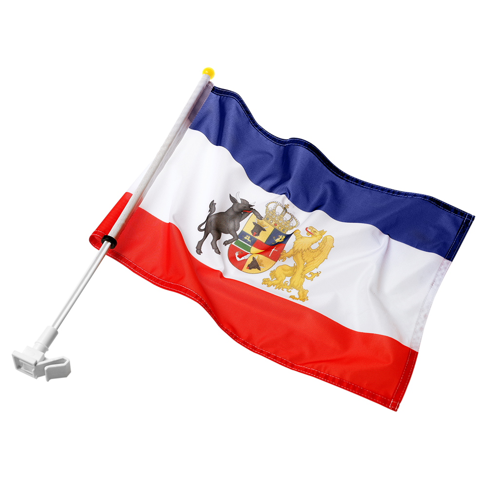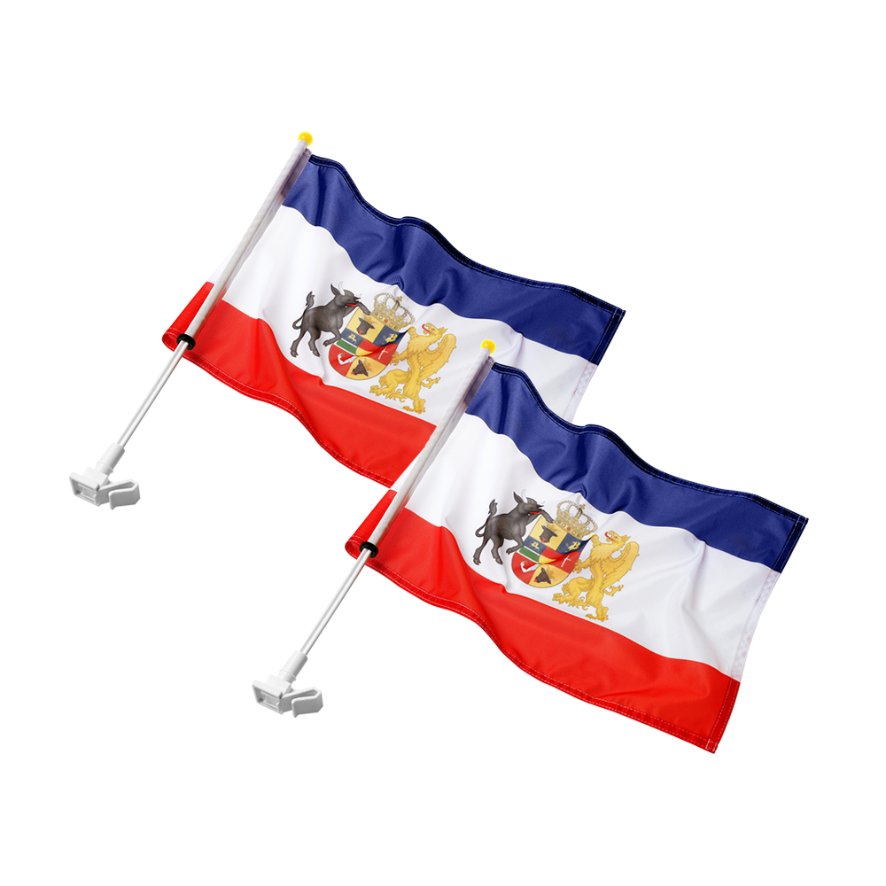 Wir zeigen Flagge! Die mecklenburger Flagge mit dem Wappen des Grossherzogthums Mecklenburg-Schwerin/Mecklenburg-Strelitz zum Anstecken an Dein Autofenster. Einfach Autofenster herunterlassen, Fahne anstecken und anschließend das Fenster wieder hochlassen.