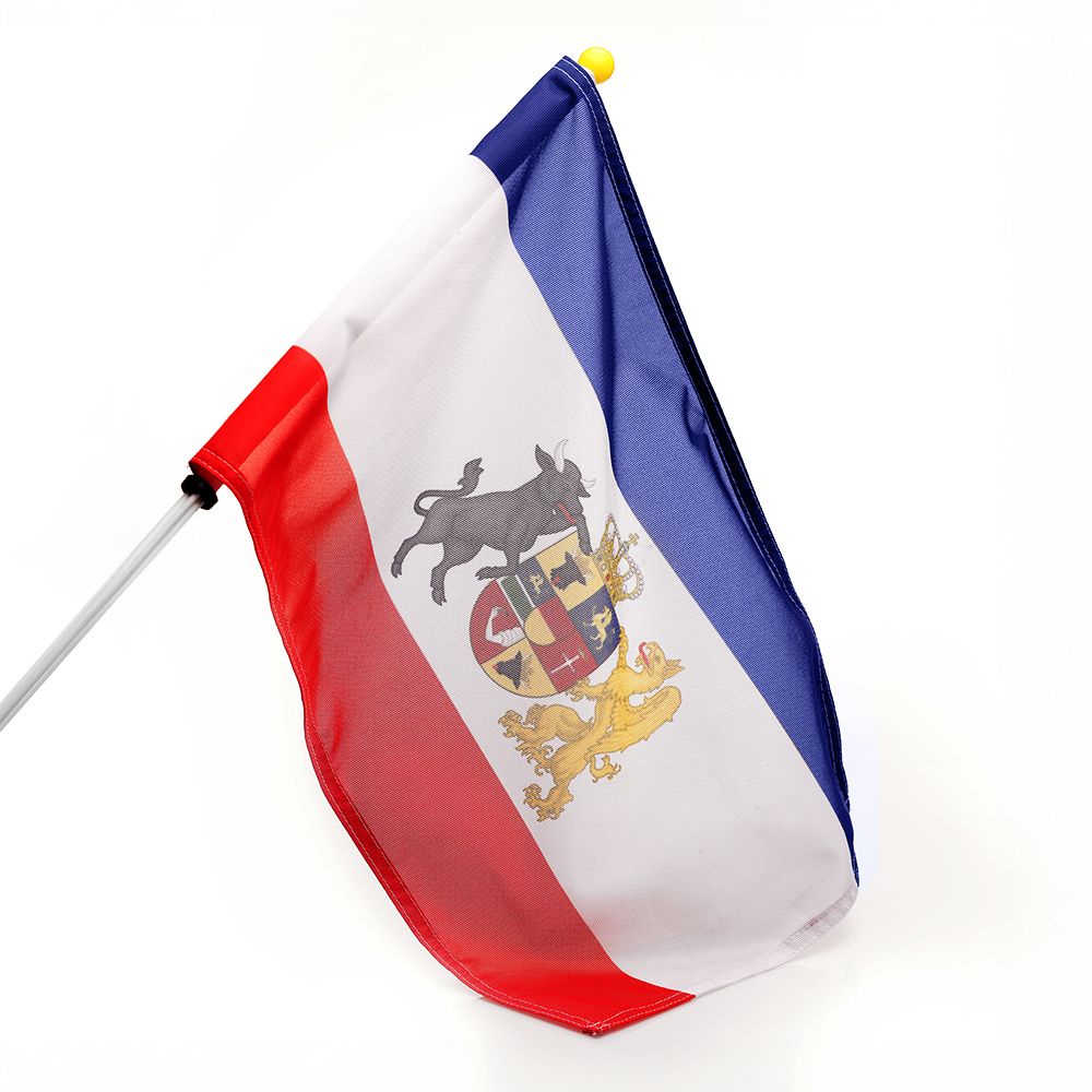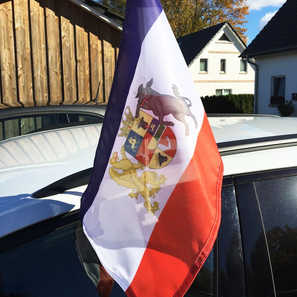 Wir zeigen Flagge! Die mecklenburger Flagge mit dem Wappen des Grossherzogthums Mecklenburg-Schwerin/Mecklenburg-Strelitz zum Anstecken an Dein Autofenster. Einfach Autofenster herunterlassen, Fahne anstecken und anschließend das Fenster wieder hochlassen.